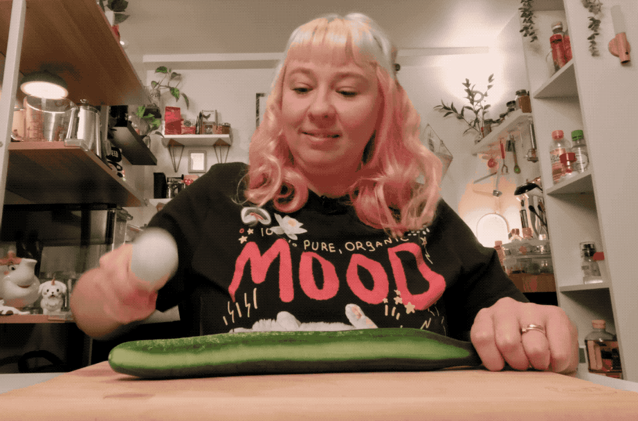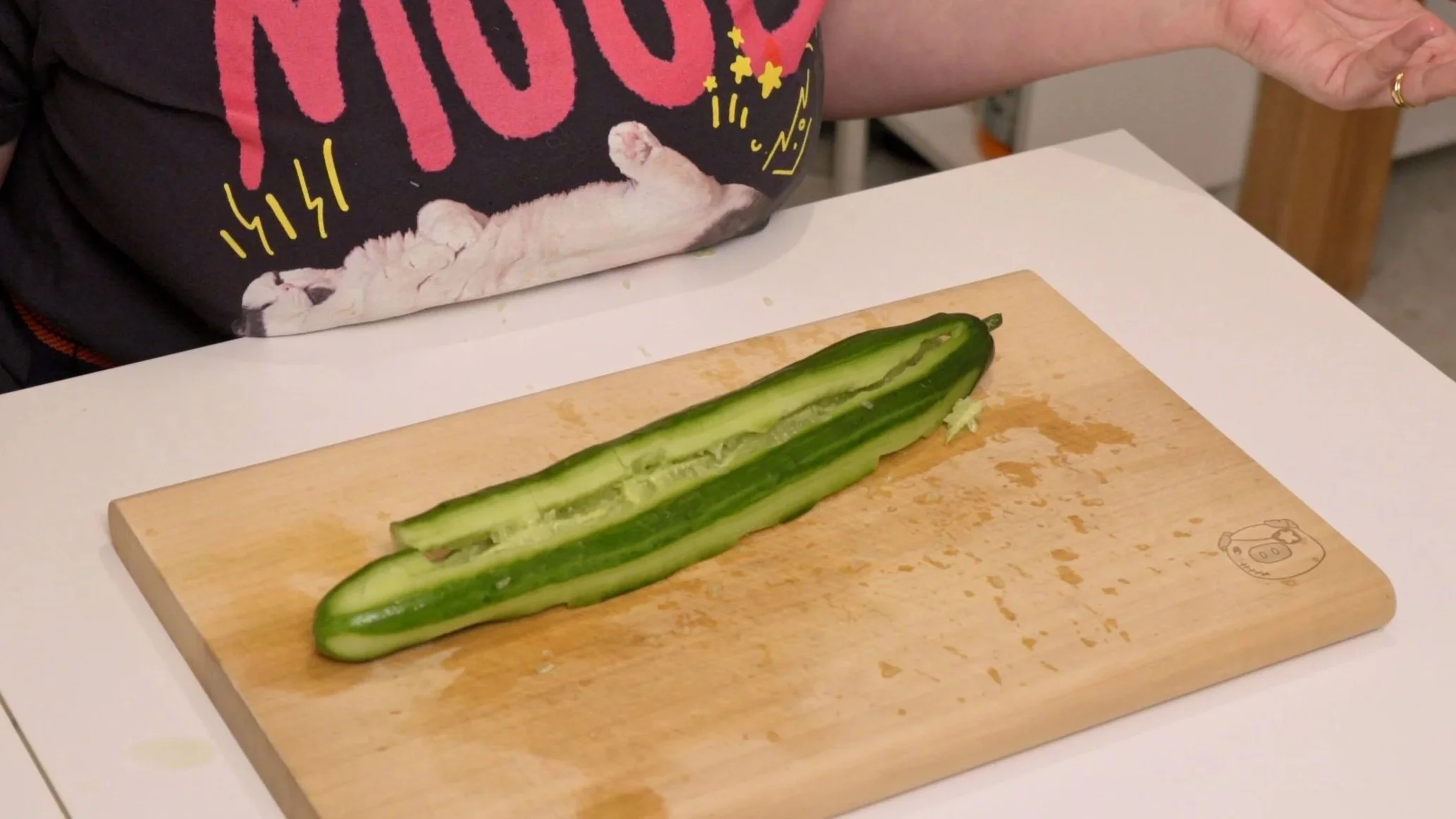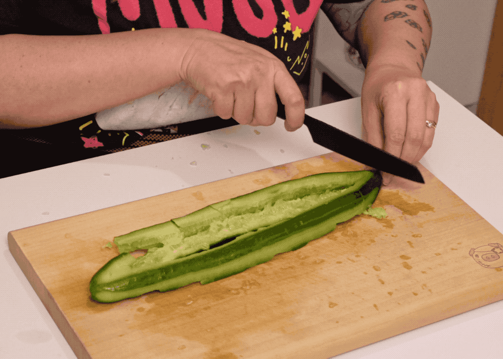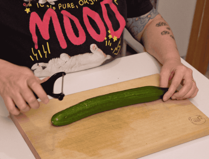 PRO TIP: Put the cucumber inside a large ziploc bag to prevent flying pieces