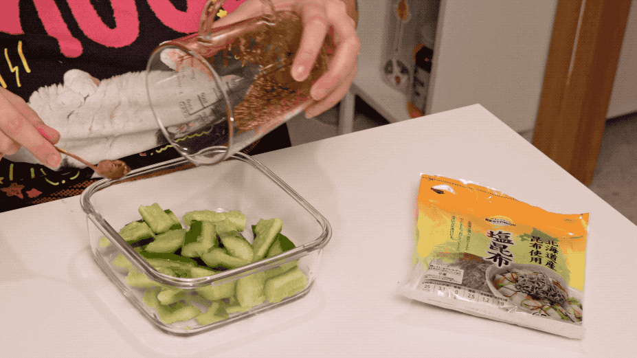 PRO TIP: Aim to have a roughly a strand of shio kombu for each piece of cucumber