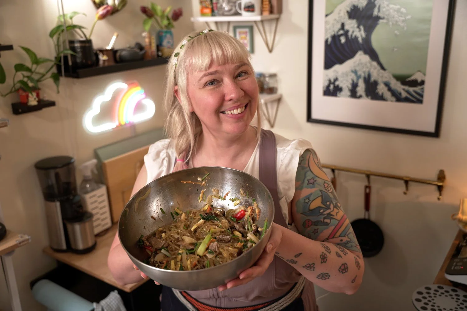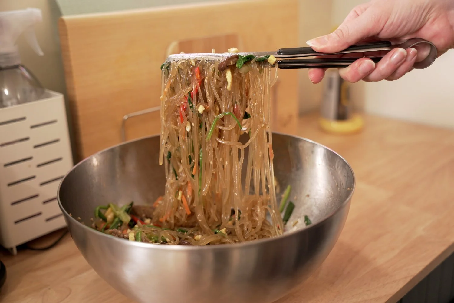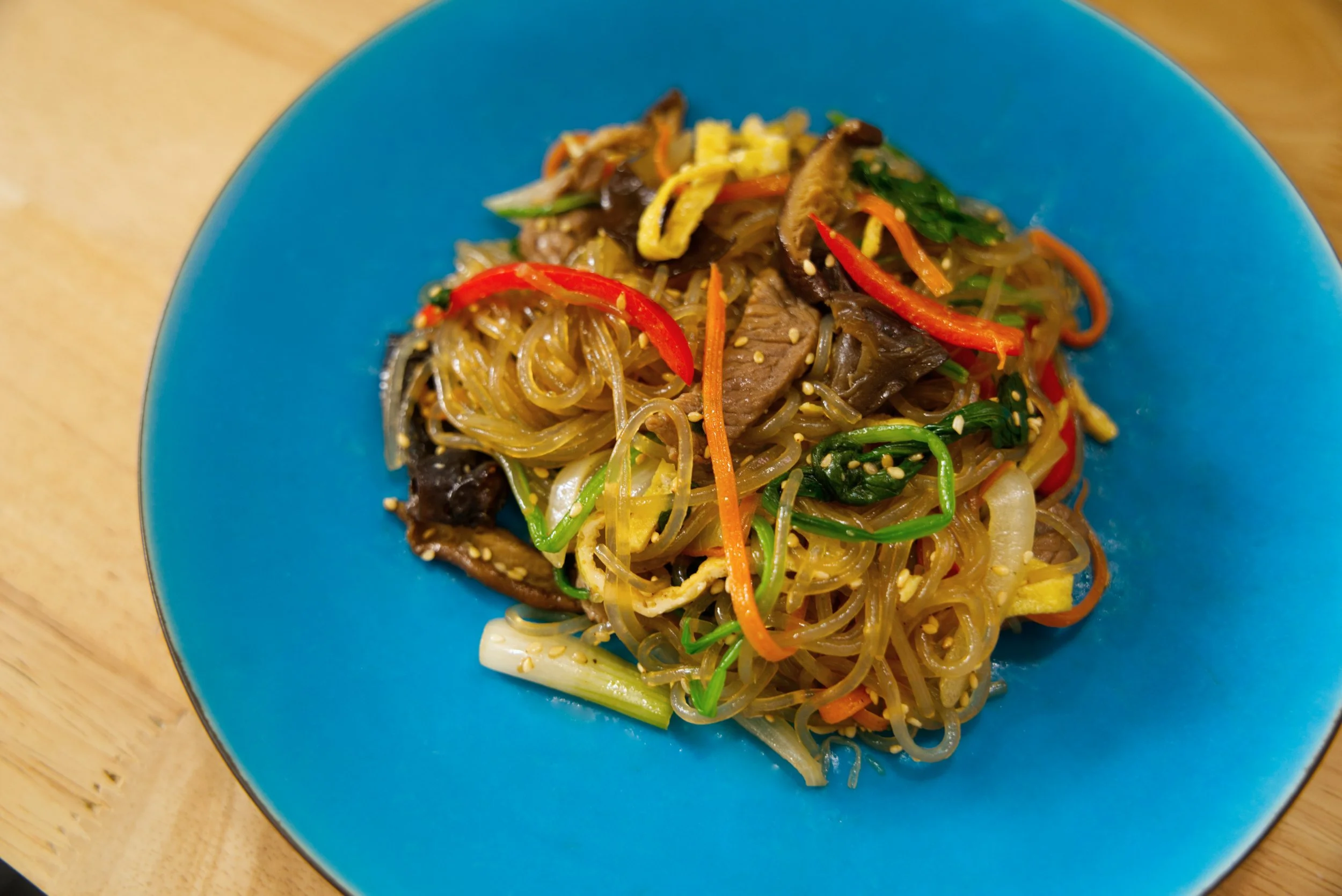 Japchae is a sweet and salty Korean noodle dish. Made using sweet potato noodles called 당면 “Dangmyeon”, japchae has a delightful texture and a colourful medley of ingredients.