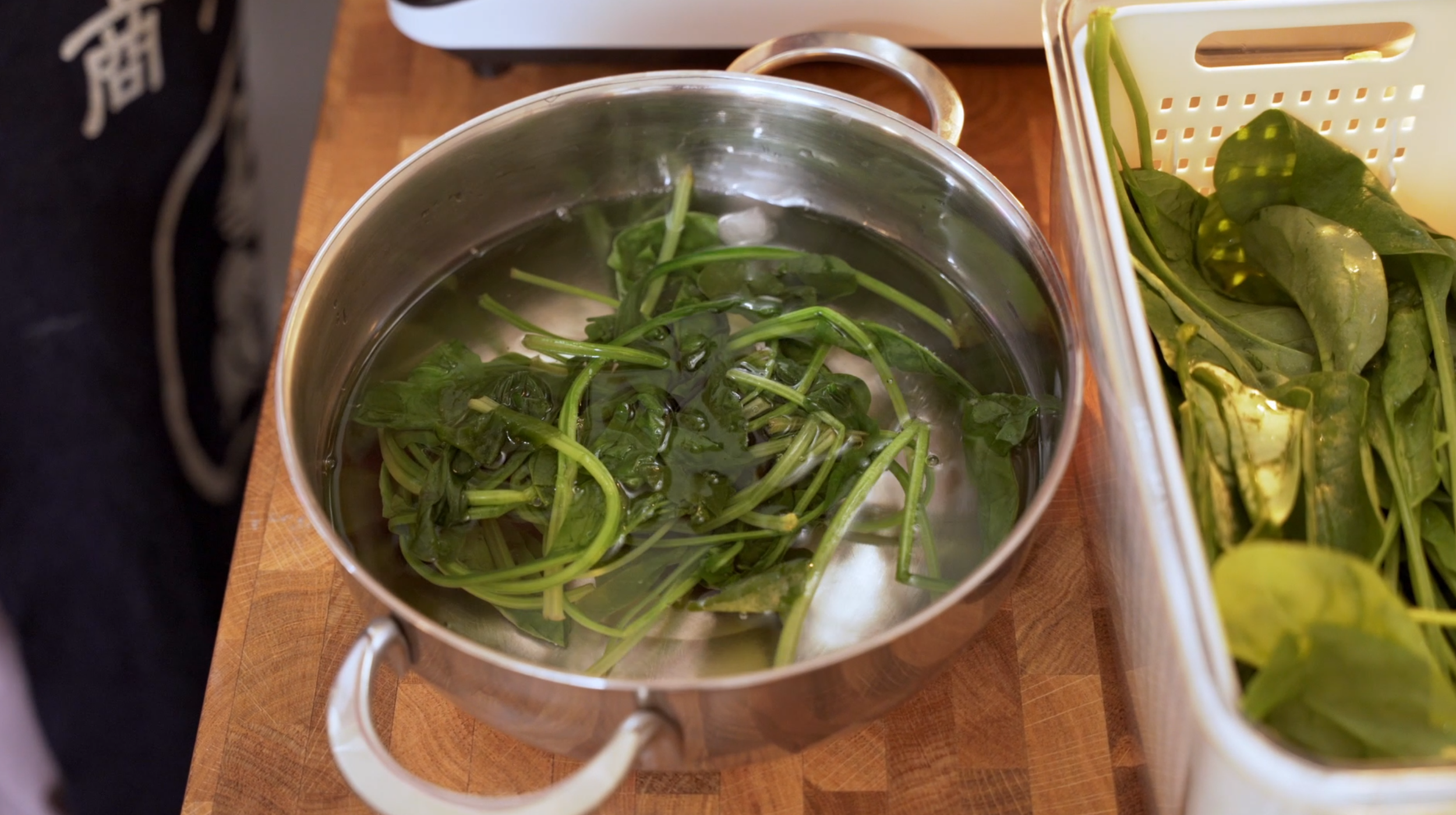 Put the spinach into ice water immediately to stop the cooking. The colour should be a vibrant, dark green!