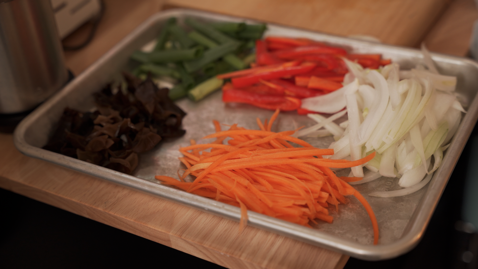 Wash and then julienne the large onion, bell pepper, carrot, green onions, shiitake mushrooms, and wood ear mushrooms into thin strips.