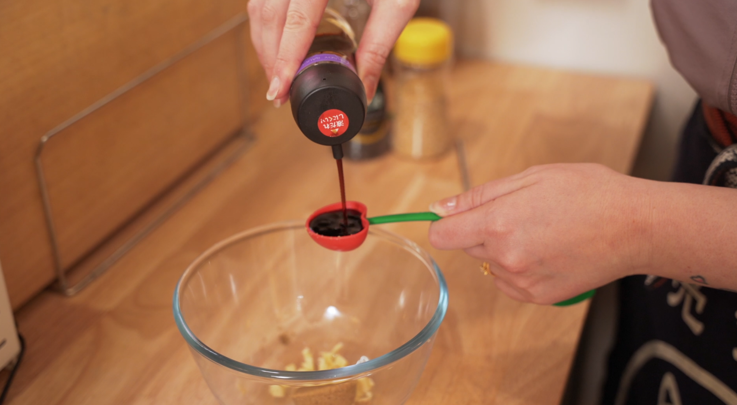 Add soy sauce, brown sugar (or honey), Korean sesame oil, toasted sesame seeds, and black pepper to a measuring jug.