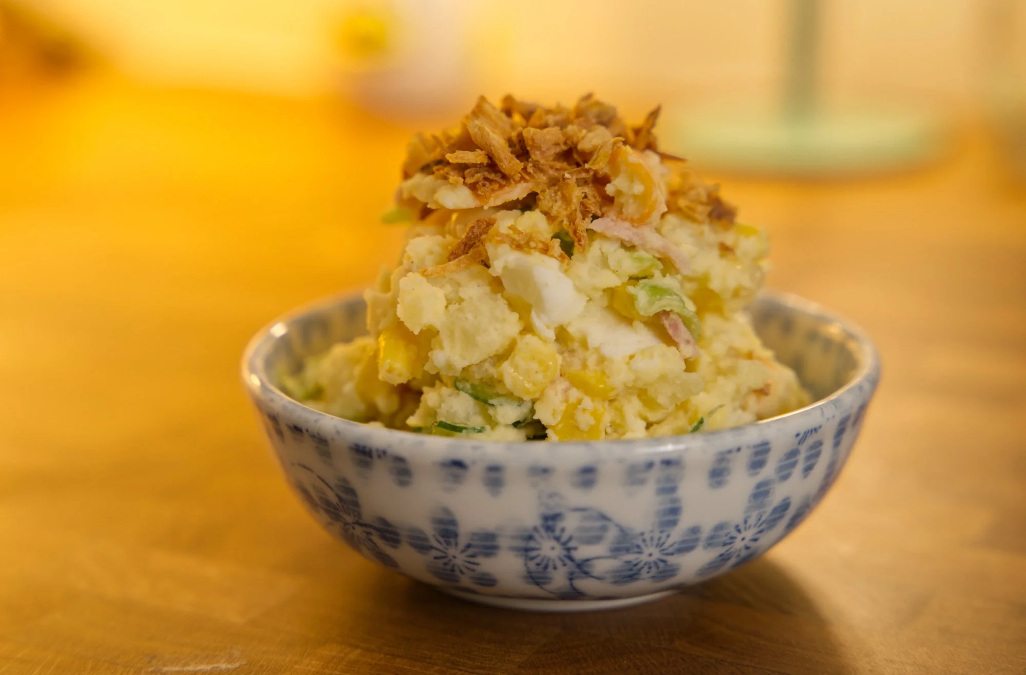 Once you’ve created your potato salad, adding dry toppings such as dried fried onions or sprinkles of katsuobushi (dried bonito tuna) can add a nice extra crunch and smoky hit to the dish.