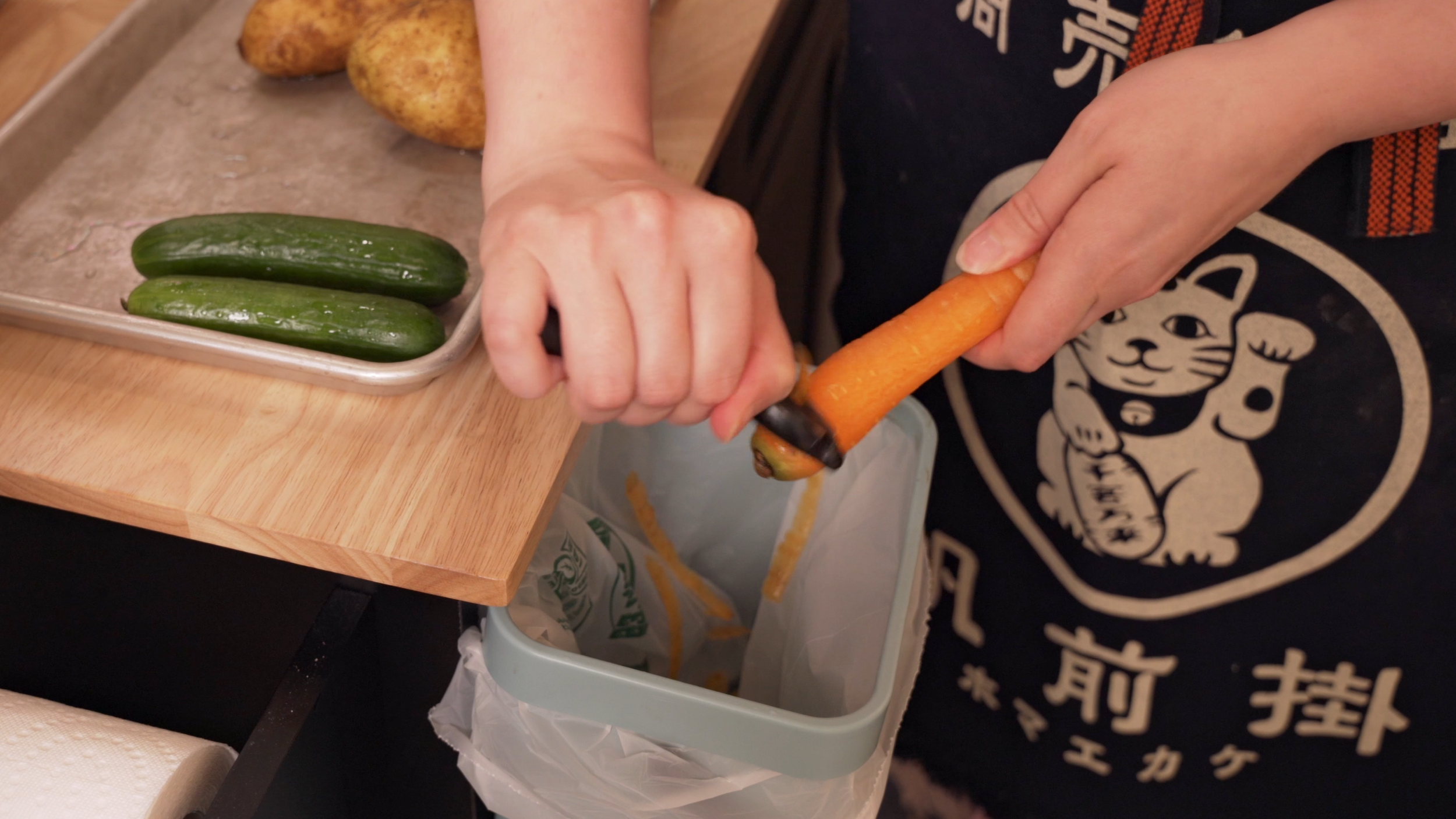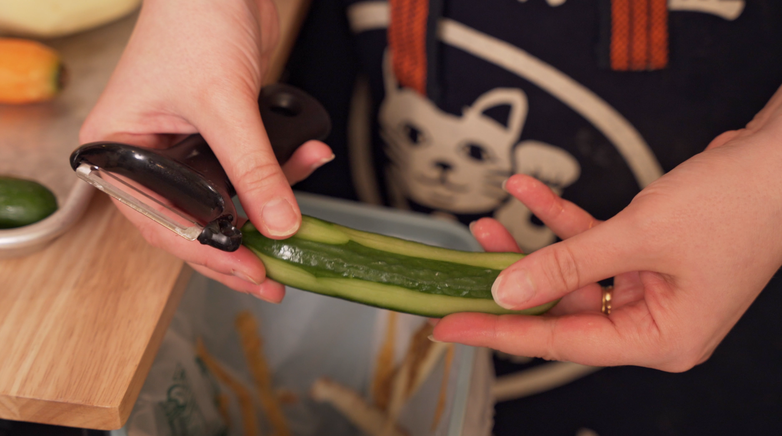 PRO TIP: Taste your cucumber and decide how much skin you need to peel.
