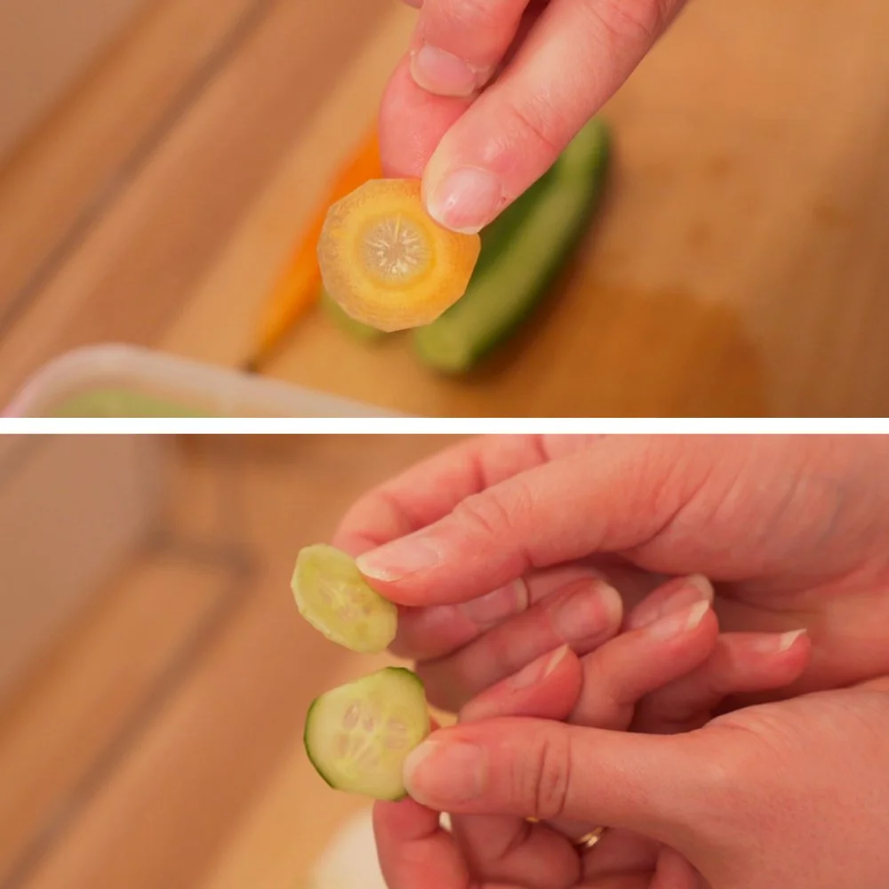 Slice the cucumber and carrot into very thin discs, I use a mandoline slicer.
